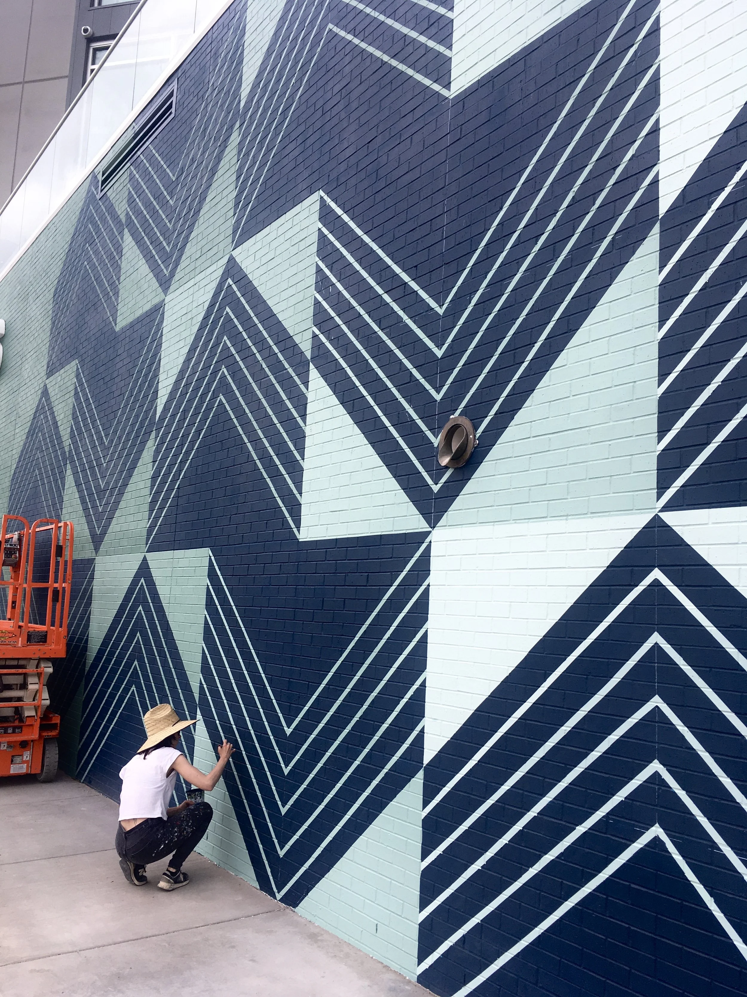 “Blossoms for Makita”, Acrylic & latex paint, 24x45’, The HUB, Denver, CO, 2018. Photo Credit: Caleb Tkach